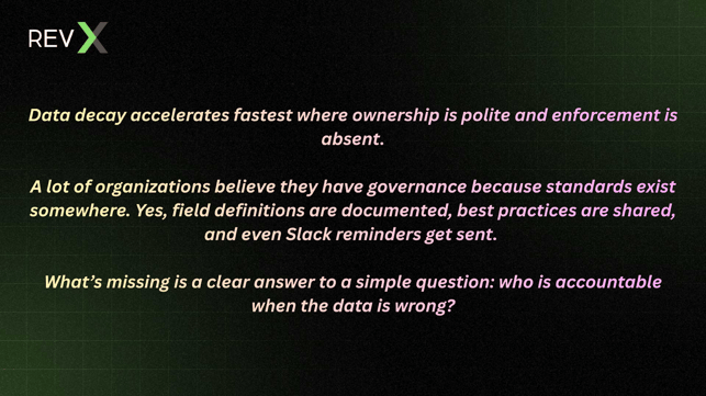 Key takeaway: Data governance breaks down when truth has no owner. Without explicit accountability and enforced rules, accuracy becomes negotiable, and revenue systems inherit that instability.