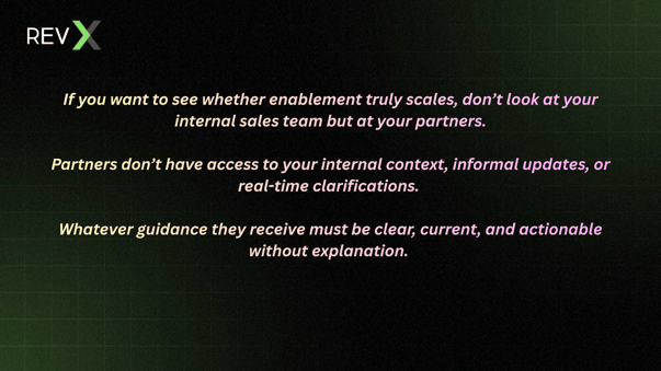 Direct sales teams can rely on tribal knowledge, but partners cannot. They depend entirely on enablement to act correctly.