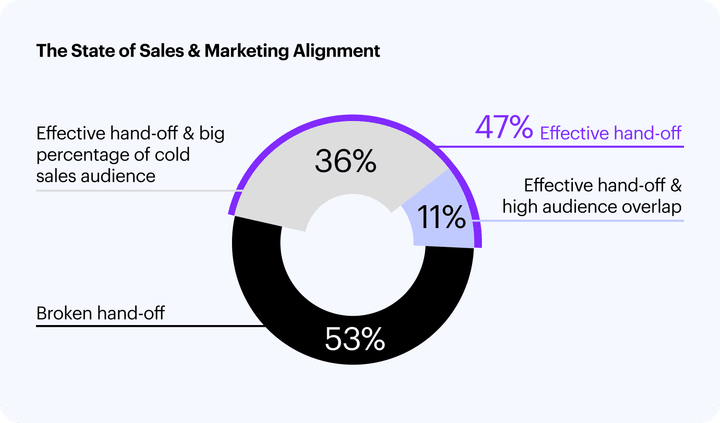 As the graph shows, 53% of companies struggle with a broken hand-off, where sales follow up on fewer than 35% of prospects engaged by marketing.