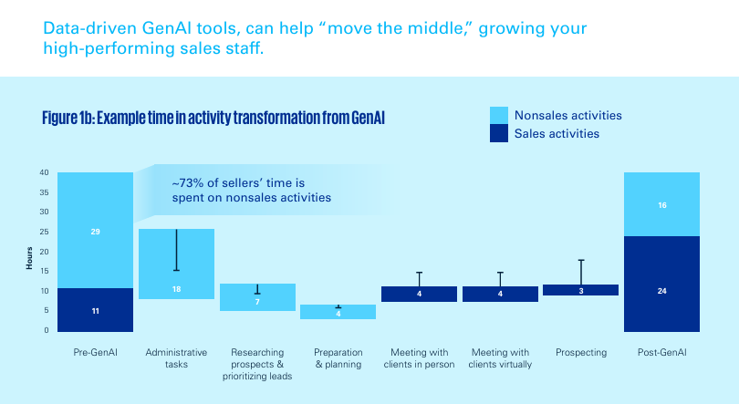 GenAI can unlock significant sales potential by enabling average performers to operate more like top sellers and freeing up more time for customer engagement. In doing so, it helps organizations “move the middle,” boosting overall sales productivity and performance.