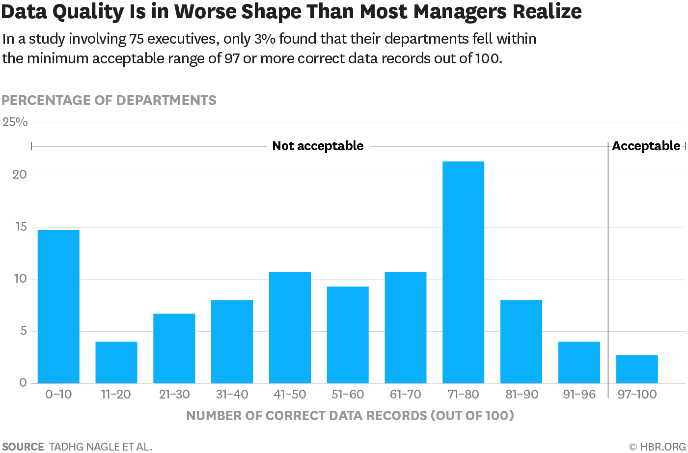 - As astonishing as it may sound, a staggering 97% of companies' data fails to meet even the most basic quality standards, as per the Harvard Business Review.